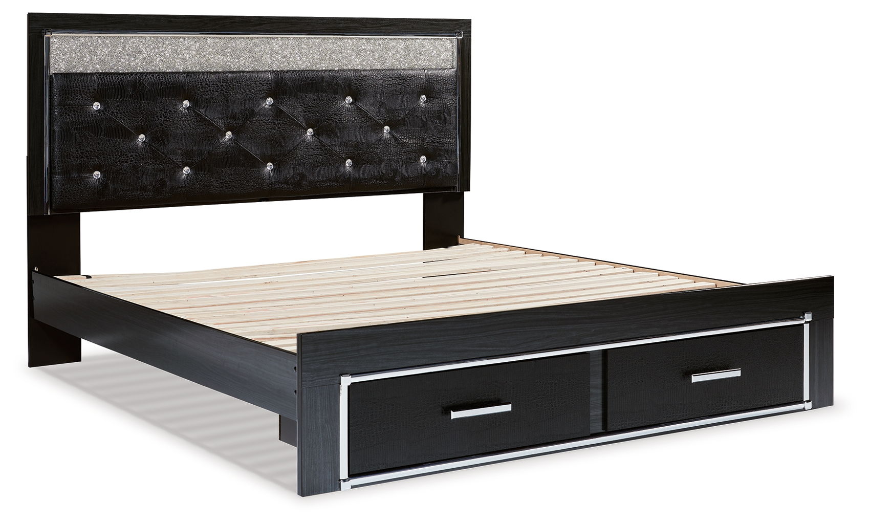 Rest easy. The luxurious look you’ve been dreaming of is yours for the taking, at a price sure to put you at ease. This queen upholstered panel platform bed brings a sense of old Hollywood with a contemporary flair. A deep, dark finish, faceted chrome-tone accents and LED lighting exude Hollywood-chic style to the max. Padded windowpane stitching on the sleek, black upholstery infuses a sumptuous look that’s upscale and indulgent, and utterly on trend. Double drawers at the foot of the bed provide space-saving storage.