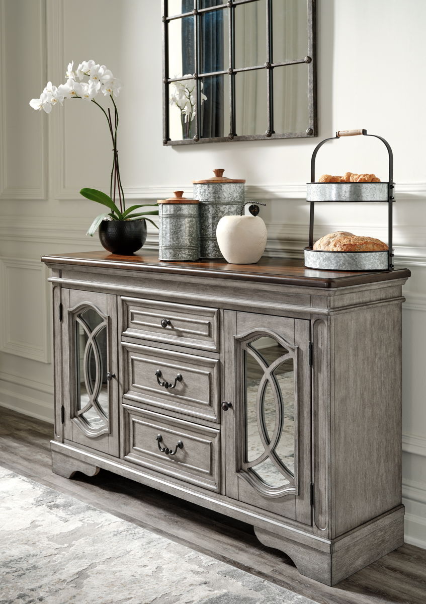 This dining room group adds understated beauty to any dining space with its traditional cottage design. Its outstanding two-tone finish features an antiqued gray body with a rich deep walnut brown top. This ample round table includes one extension leaf to accommodate all your guests comfortably. We love how the classic farmhouse ladderback chair gets a fresh makeover, understated yet rich with character. The server’s three smooth-gliding drawers with dovetail construction and black felt bottoms are perfect for storing more delicate items. Perfect for school night dinners and full-on family feasts alike, it comfortably seats up to six when fully extended. Traditional cottage design. An outstanding two-tone finish featuring an antiqued gray body with a rich deep walnut brown finish on the tops. 48″ round table extends to a 70″ long oval with one 24″ leaf. Matching tapered table and chair legs.