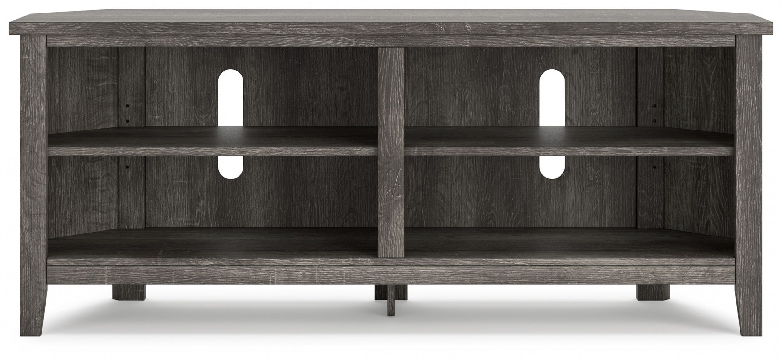 With its replicated weathered oak finish and authentic charm, this corner TV stand is right in tune with your relaxed approach to high style. Beautifully shaped to nestle into any corner, it’s well equipped with shelving and cutouts for wire management. What a mastery in modern farmhouse living for small spaces.