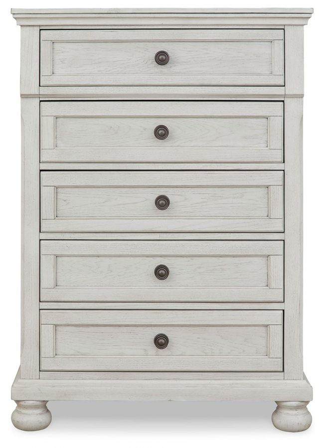 Elegant, timeless furnishings take your bedroom to the next level. Nothing does that better than this chest of drawers. The antiqued white finish with a wonderful grain texture radiates sophistication, while dark bronze-tone knobs add an ornate touch. Felt finishing in the upper drawers rounds out this tasteful piece.