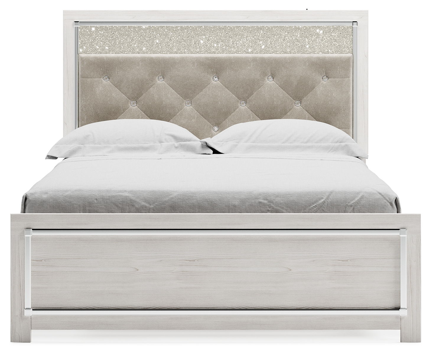 The epitome of fashion-forward design, this queen upholstered panel headboard is a beautiful blend of comfort and luxury. Shiny chrome-tone accents, a pearlized finish and button-tufted upholstery bring a glam touch to the richly rustic appearance. Remote-controlled LED lighting adds style and modern conveniences to your restful retreat.