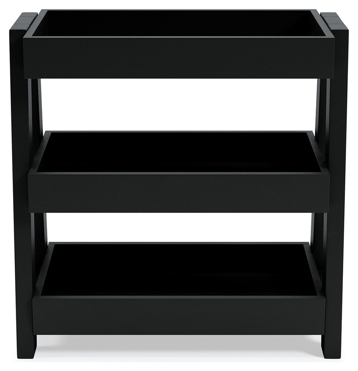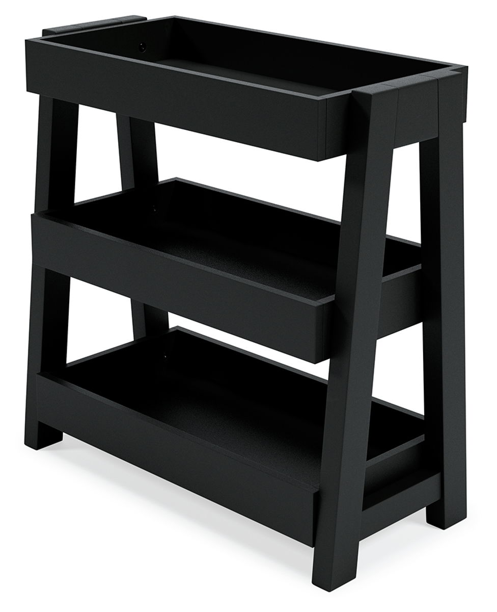 Display your child’s decor with simple style on this shelf accent table. Constructed of solid and engineered woods in a white finish, this accent table blends easily with their existing living room aesthetic. Three tray shelves can be used to show off keepsakes and collectibles, or to keep TV remotes handy.
