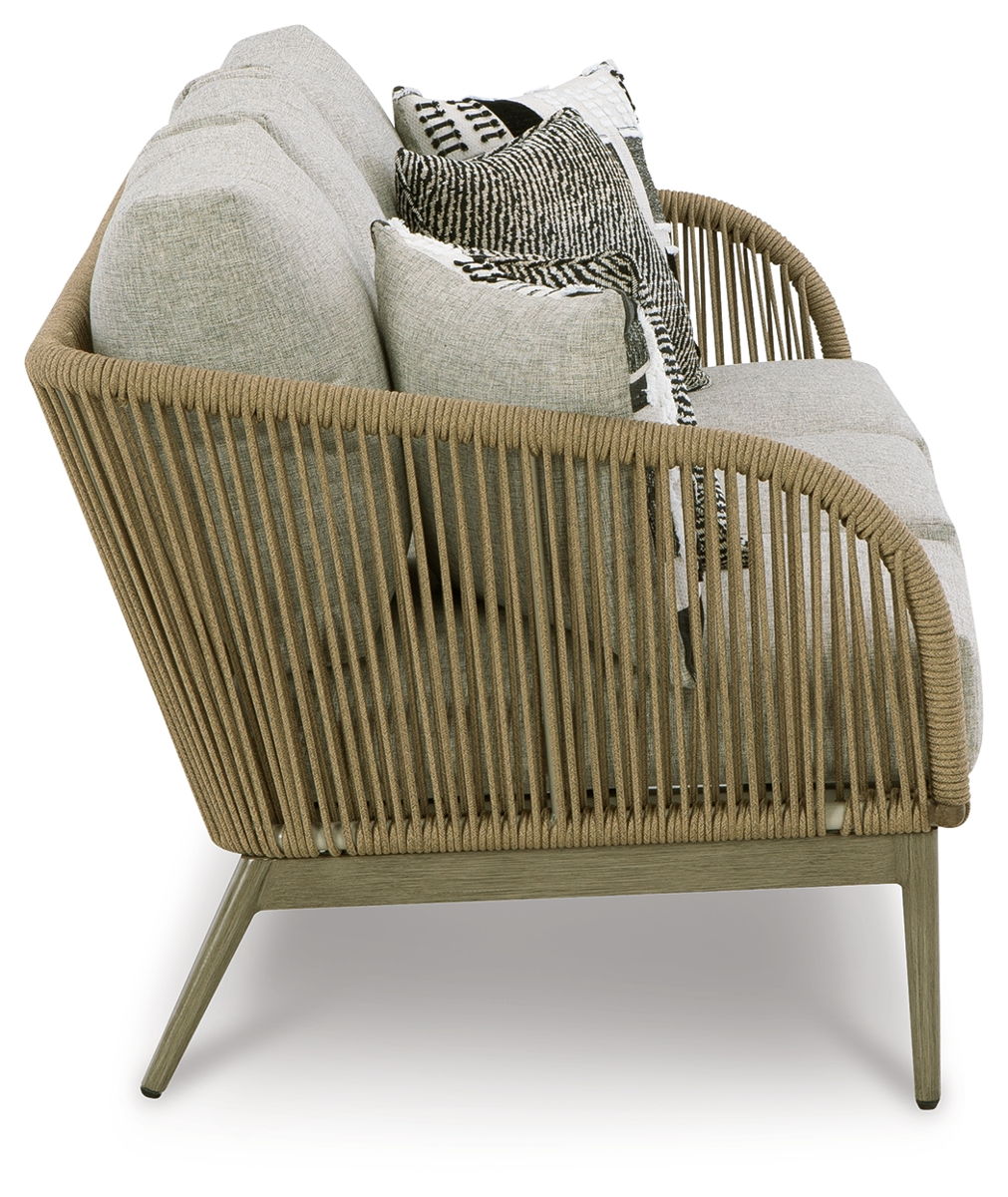 Effortless in its beauty, this outdoor sofa echoes your easygoing sensibilities. Simply stunning in a brown wood-look finish and paired with handwoven rope on a sturdy aluminum frame, it’s an ideal companion for relaxing poolside or hosting friends alfresco. And with high-performance beige Nuvella+™ fabric, this sofa makes stylish living a breeze.