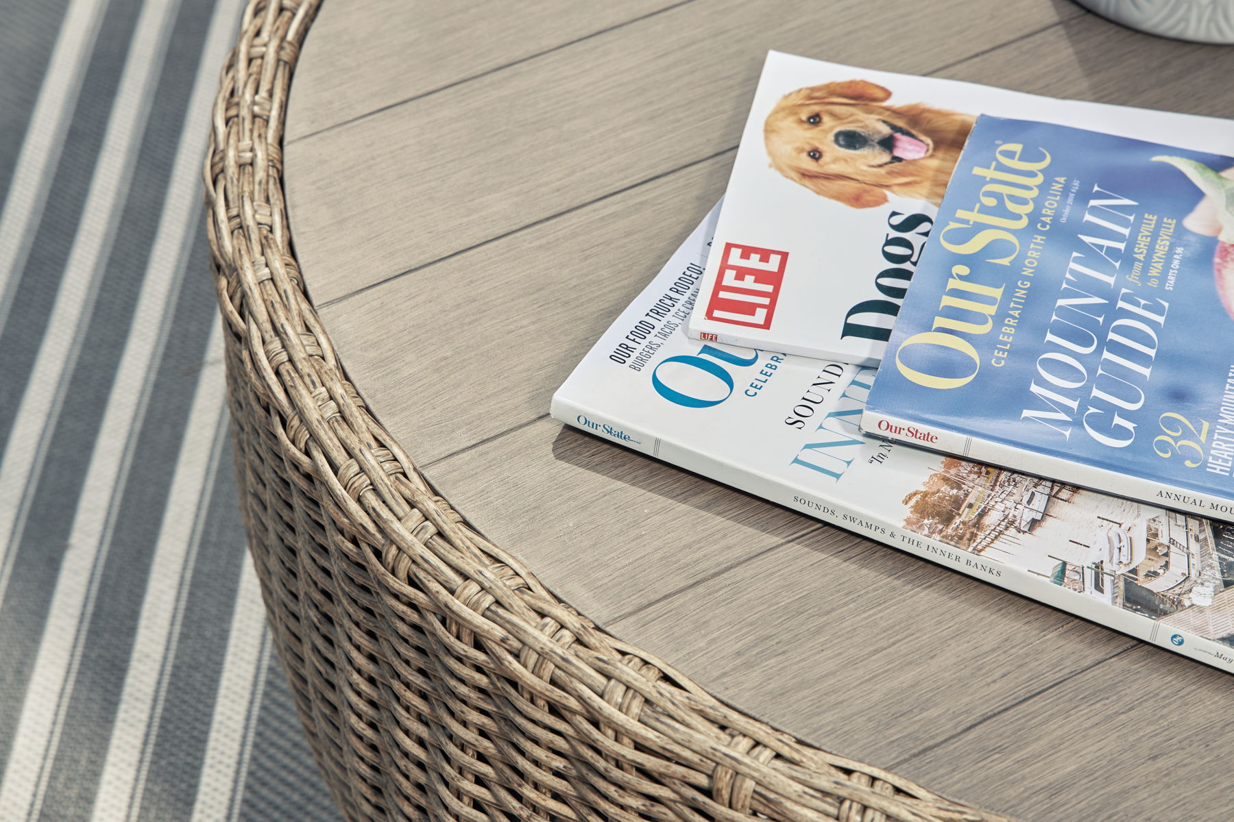 This coffee table completes your outdoor seating area with its fresh take on casual comfort. Handwoven resin wicker over a curving frame balances streamlined style and exceptional durability. An aluminum top polishes off the piece, acting as a perfect perch for snacks, beverages and decor.